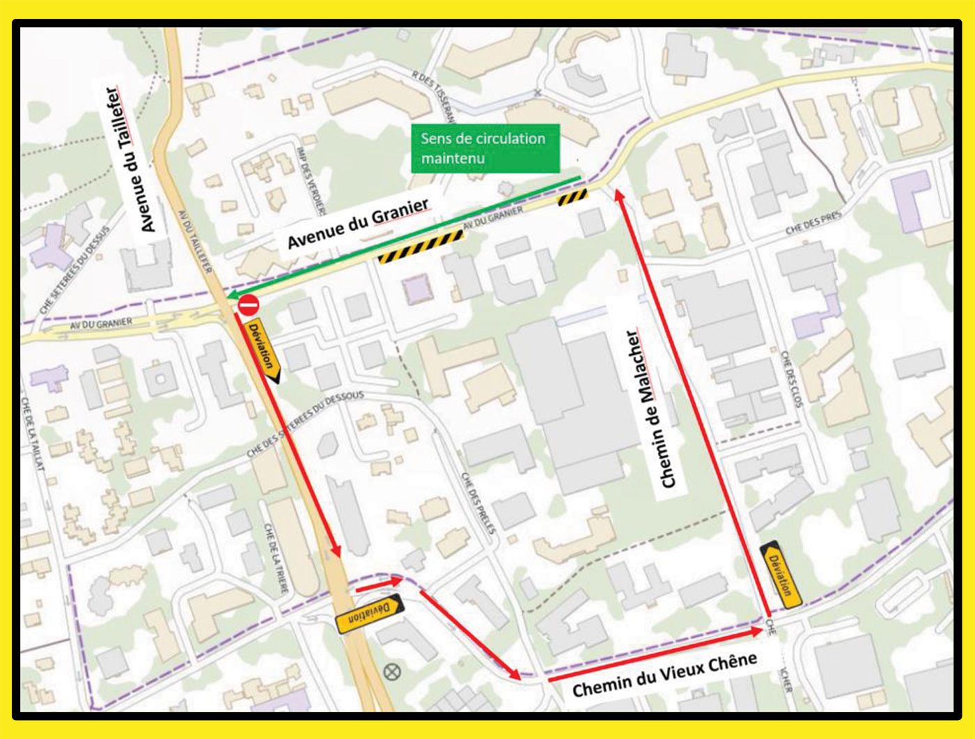 La route sera mise en sens unique dans le sens Montbonnot vers Grenoble. Les véhicules empruntant le sens inverse seront déviés par l’avenue du Taillefer, le Chemin du Vieux Chêne et le Chemin de Malacher (voir plan ci-dessous).